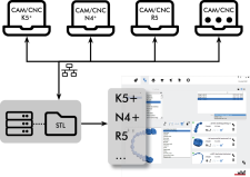 1 dentalcam-Rechner kann berechnete Auftragsdaten an mehrere dentalcnc-Rechner schicken, die mit Ihren Maschinen verbunden sind.