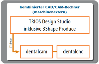 Um Aufträge für Arbeiten zu erstellen, arbeiten Sie beim 3Shape Produce-Workflow sowohl mit TRIOS Design Studio als auch mit dentalcam.