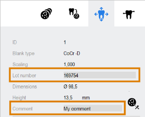 Während die Rohlingsparameter, die bei der Auftragserstellung angegeben wurden, nicht mehr änderbar sind, können Sie die Chargennummer und den Kommentar in der Nesting-Ansicht zum Anpassen von Arbeiten weiterhin bearbeiten.