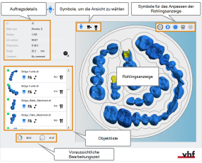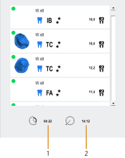 In der unteren linken Ecke werden die geschätzte Bearbeitungszeit und die Schlichtzeit des aktuellen Auftrags angezeigt. dentalcam passt beide Werte automatisch an, während Sie den Rohling bearbeiten.