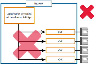 Versuchen Sie nicht, ein gemeinsames Verzeichnis für berechnete Auftragsdaten zu erstellen, um Aufträge auf verschiedenen Maschinen mit diesem Ordner zu fertigen. Sie brauchen eine fest zugewiesene dentalcnc-Installation für jede Maschine einschließlich eines Verzeichnisses für berechnete Auftragsdaten. Wenn Sie 1 CAM-RechnerGeschlossen Der Rechner, der mit Ihrer Maschine verbunden ist und auf dem dentalcam und dentalcnc laufen. mit mehreren Maschinen verwenden möchten, lesen Sie hier weiter.