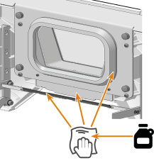 Falls notwendig, reinigen Sie die Arbeitsraumtürdichtung, die Dichtlippe der Querstrebe, die Auflagefläche, die Rahmenfläche des Sichtfensters, die Abtropfkante und die Dichtlippe der Rücklaufmatte mit TecPowder.