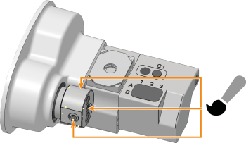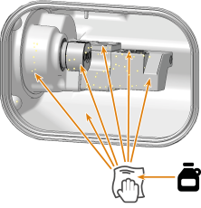 - Reinigen Sie die 2 gegenüberliegenden Öffnungen (orange markiert) in der Düsenplatte mit der Interdentalbürste. Bewegen Sie die Bürste dabei auf und ab.