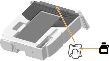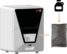 Reinigen Sie alle Flächen und Spalten im Arbeitsraum gründlich mit dem feuchten Tuch. Verwenden Sie bei Bedarf einen milden Reiniger.