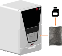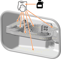 Reinigen Sie alle Flächen und Spalten im Arbeitsraum gründlich mit dem trockenen Tuch. Verwenden Sie bei Bedarf einen milden Reiniger.