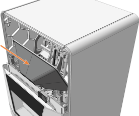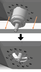 Setzen Sie die Bolzen (orange markiert) der Serviceabdeckung in die Halterungen (grün markiert) an der Sicherheitsabdeckung ein.
