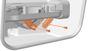 - Falls die 2 Schrauben auf der Rückseite des Rohlingshalters mit Abdeckkappen (orange markiert) bedeckt sind:
