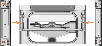 Öffnen Sie die Arbeitsraumtür soweit, dass die unteren Arbeitsraumtürhebel (grün markiert) parallel zum Maschinenboden ausgerichtet sind.