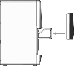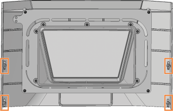 Halten Sie die Arbeitsraumtür fest. Lösen Sie mit dem Drehmoment-Schraubendreher1,5 Nm die 4 Schrauben (orange markiert), die die Arbeitsraumtür an der Arbeitsraumtürhalterung befestigen.