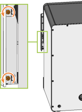 Setzen Sie die Ersatz-Arbeitsraumtür so an, dass die 4 Schraubenlöcher auf der Rückseite der Arbeitsraumtür (orange markiert) auf den 4 Schraubenlöchern in der Arbeitsraumtürhalterung (grün markiert) liegen.