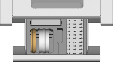 Im Zubehörbehälter unter dem Arbeitsraum können Sie Rohlinge, Werkzeuge und das Spindel-Service-Set griffbereit aufbewahren.