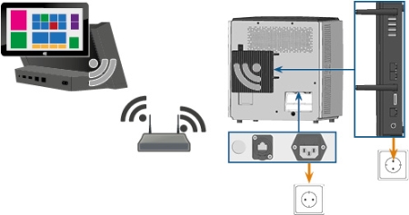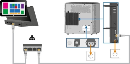 1. Hängen Sie die Haken (blau markiert) der Halterung am CAM-RechnerGeschlossen Der Rechner, der mit Ihrer Maschine verbunden ist und auf dem dentalcam und dentalcnc laufen. in die Schlitze (orange markiert) der Halterung an der Maschine ein.