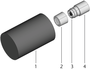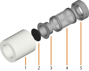 3. Entfernen Sie die Ventilfeder [2], die Kugel [3] und den Ventilsitz [4] von der Buchse [5] und der Kappe [1] der Kupplung.