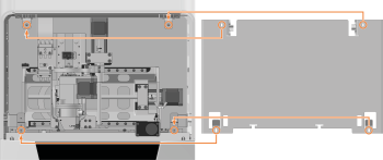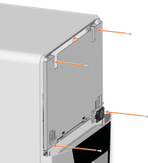 Setzen Sie die Bolzen (orange markiert) der Serviceabdeckung in die Halterungen (grün markiert) an der Sicherheitsabdeckung ein.