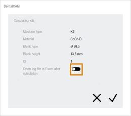 (Optional) If a log is to be opened directly in Microsoft Excel after the calculation, activate Open log file in Excel after calculation. The log contains an illustration of the blank, basic job details and a list of all objects in the blank.