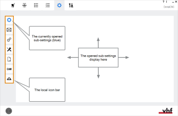 The dentalcnc application settings contains a local icon bar which offers you access to the following sub-settings: