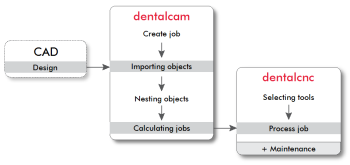 If you break down the workflow of dentalcam and dentalcnc, you will discover that it can be quite simple. It doesn’t matter if you are new to computer aided manufacturing or a veteran, all required steps in the manufacturing software