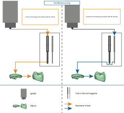 - Parallel processingThe tool usage sequence is determined on the basis of the tools: The machine fetches a tool and machines all objects in the blank that the tool is required for. The machine does not fetch the next tool until the tool is no longer needed for any object. This process is repeated until all objects are fully machined with all required tools.
