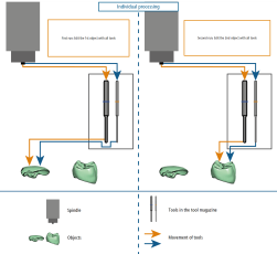 - Individual processingThe tool usage sequence is determined on the basis of the objects: The machine processes every object completely with all tools that are required for the object before moving on to the next object. This process is repeated until all objects are fully machined (recommended).