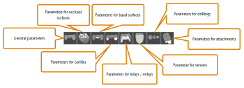 The settings for cavities are divided into settings for cavities in inlays / onlays, veneers and all other indications.