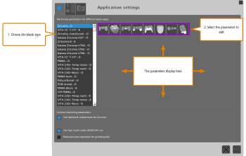 - The machining parameters for the selected combination of parameter group and blank type display in the central area of the window.