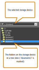 The file browser consists of 2 elements: A drop-down list to select the storage device and a tree view showing the folders on the selected device: