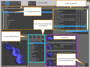 Shortcut: You can directly add an STL file to the import list by double-clicking on it in the file list. dentalcam will use the currently marked calculation options for the object (you can change them later in the import list). Use this feature to quickly add objects of the same type to the import list.