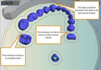 After importing your object files into dentalcam, you have to nest them in your blank. Nesting your objects means to position them in the blank, add bars, sinter bars and drops if required. Your goal is to use your blanks as efficiently as possible while at the same time achieve a high machining quality.