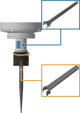 - Place the wrench on the flat surfaces (marked blue) on the spindle.