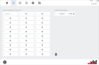 In dentalcnc you can check the required tools and tool lives. A tool required for a job must be assigned to the virtual tool magazine, the tool life must be reset after exchanging a tool. To do this, use the views Machining and Tool Management: