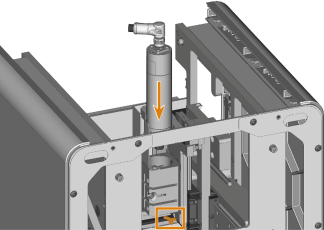 Insert the spindle from above into the spindle holder until the spindle rests on the stop (marked orange). Turn the spindle such that the spindle cable (marked blue) rests on the holder (marked orange).