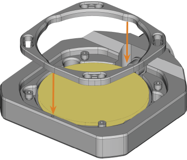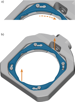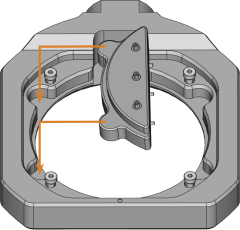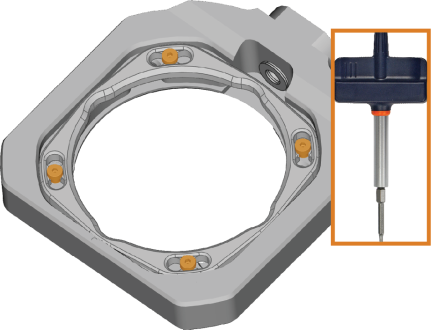 - Loosen the 4 screws (marked orange in the figure) which attach the fixing ring to the blank holder.