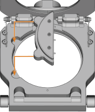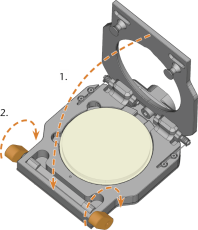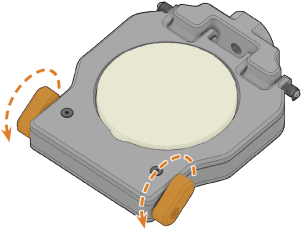 - Lock the blank holder by pushing the left and/or right blank holder lever (marked orange in the figure) away from you until you notice a distinct resistance and the levers are firmly closed. Do not apply excessive force.