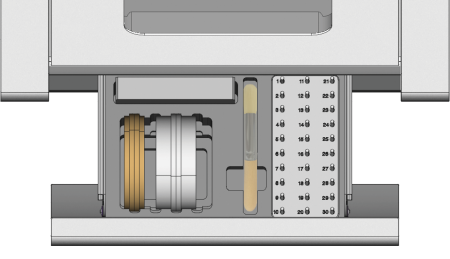 In the accessories container below the working chamber, you can store blanks, tools and the spindle service set so they are easily accessible.