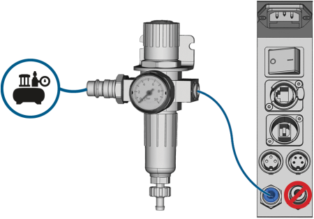 - Connect the external compressed air supply to the left pneumatic connection of the compressed air regulator.