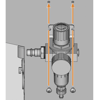 - Mount the compressed air regulator in an upright position, using the oval-head screws provided in the bores.
