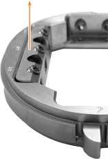 The positioning pins (marked green) on the blank holder must fit into the openings (marked orange) on the back of the abutment holder.