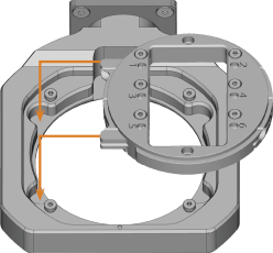 - Loosen the 4 screws (marked orange in the figure) which attach the fixing ring to the blank holder.