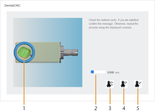 Si ha activado la opción Controlar las cavidades manualmente durante el mecanizado en los ajustes de dentalcam para el tipo de pieza en bruto actual, dentalcnc interrumpe el mecanizado después de cada cavidad, gira la pieza en bruto para que pueda comprobar la cavidad y abre la siguiente ventana: