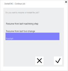 - Se abre una ventana de diálogo. dentalcnc le pregunta si desea reanudar o reiniciar la tarea.
