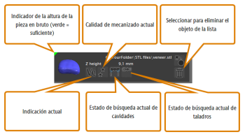 - Visualización de la altura de pieza en bruto y de la disponibilidad de datosEste indicador le notifica si la pieza en bruto que está editando actualmente tiene una altura suficiente para el objeto y si todos los datos están disponibles.