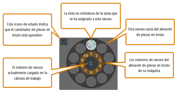 Debajo de los iconos para controlar la máquina se muestra la ilustración del almacén de piezas en brutoCerrado Parte del cambiador de piezas en bruto en la que se almacenan las piezas en bruto para la carga automática.. Esta le permite manejar el cambiador de piezas en brutoCerrado El componente de la máquina que almacena varias piezas en bruto en un almacén y es capaz de cargarlas automáticamente en la cámara de trabajo.. Si utiliza la búsqueda, utilice cambiador de piezas en bruto o almacén de piezas en bruto y el almacén de piezas en brutoCerrado Parte del cambiador de piezas en bruto en la que se almacenan las piezas en bruto para la carga automática. de su máquina.