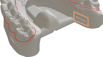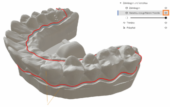 trimcam inicia el cálculo de la tarea y reconoce automáticamente la línea de corte en cuanto haya importado el primer modelo de arco dental. Tenga en cuenta lo siguiente: