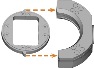 - Estrarre le 4 viti (contrassegnate in arancione) dalla parte superiore del supporto per abutment e rimuovere la maniglia dell’abutment.