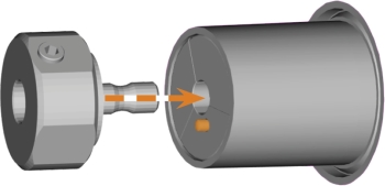 Spingere il abutment Pre-milled nel supporto fino a quando non è posizionato correttamente. La base del pezzo grezzo deve mostrare la parte piatta (evidenziata in blu) verso la parte piatta della maniglia dell'abutment (evidenziata in arancione).
