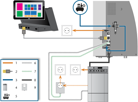 - 将开关装置的控制线缆连接到机器连接面板上的抽吸装置数据端口。