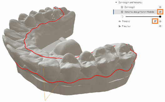重要信息:一旦您更改加工任务的其他加工参数,相关牙弓模型的计算将被更新,并且之前对修剪线的调整将被重置。