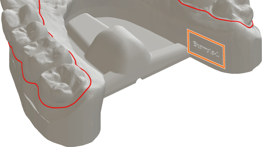 当某个牙弓模型的计算完成后,将以带底座和机器支承件的形式显示在 3D 视图中。修剪线将以红线显示。
